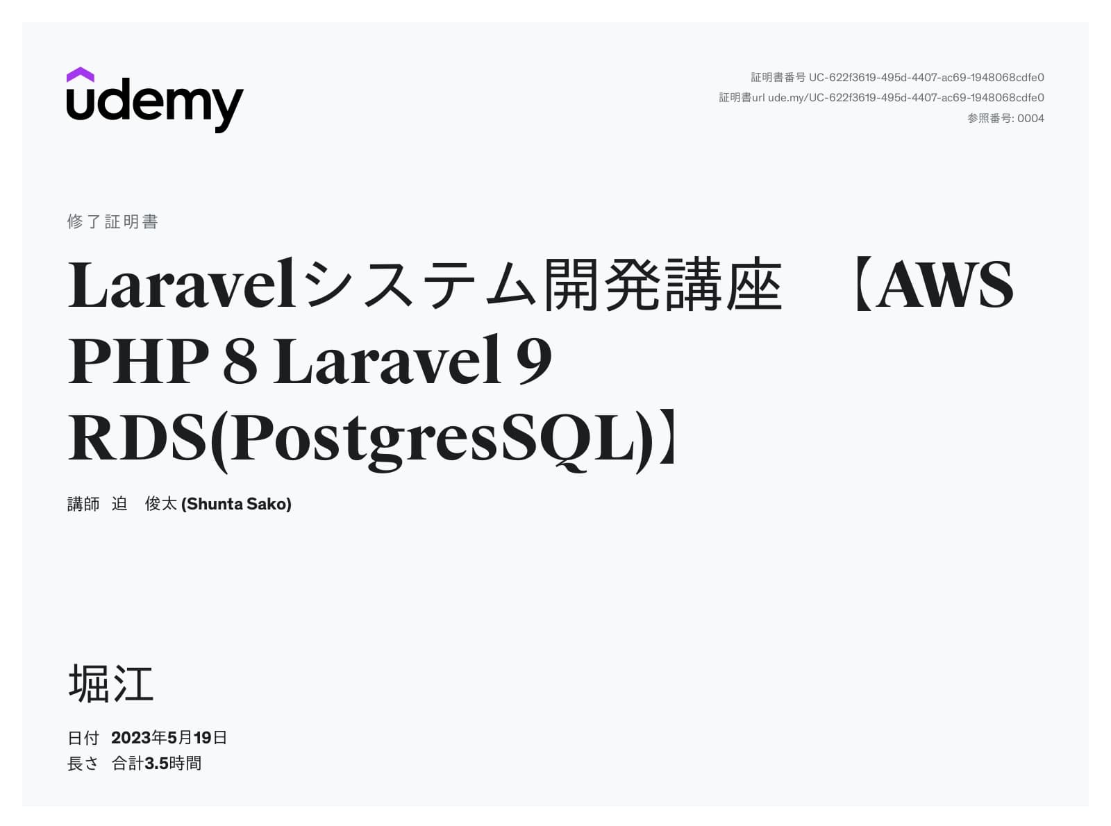 【Udemy】Laravelシステム開発講座 【AWS PHP 8 Laravel 9 RDS(PostgresSQL)】完了しました!